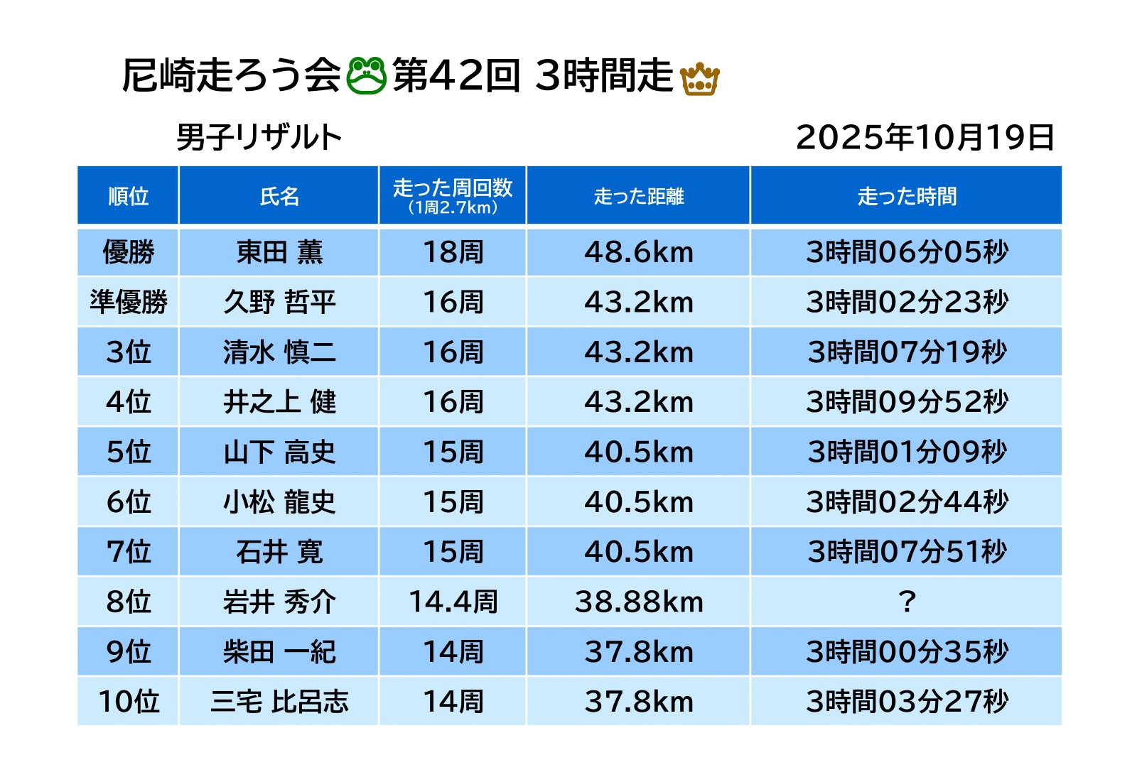 今年も大勢のランナーにご参加いただいて、賑やかに3時間走を開催することができました! 尼崎走ろう会の自慢のコース、みなさんたっぷり3時間堪能していただけましたかー🐸 今日の頑張りが今秋のマラソン大会できっと成果に結びつきますように!
